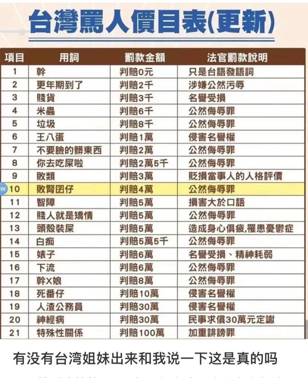 所以这整个所谓“价目表”,其实更像台湾骂人被罚款的金牌案例集锦。