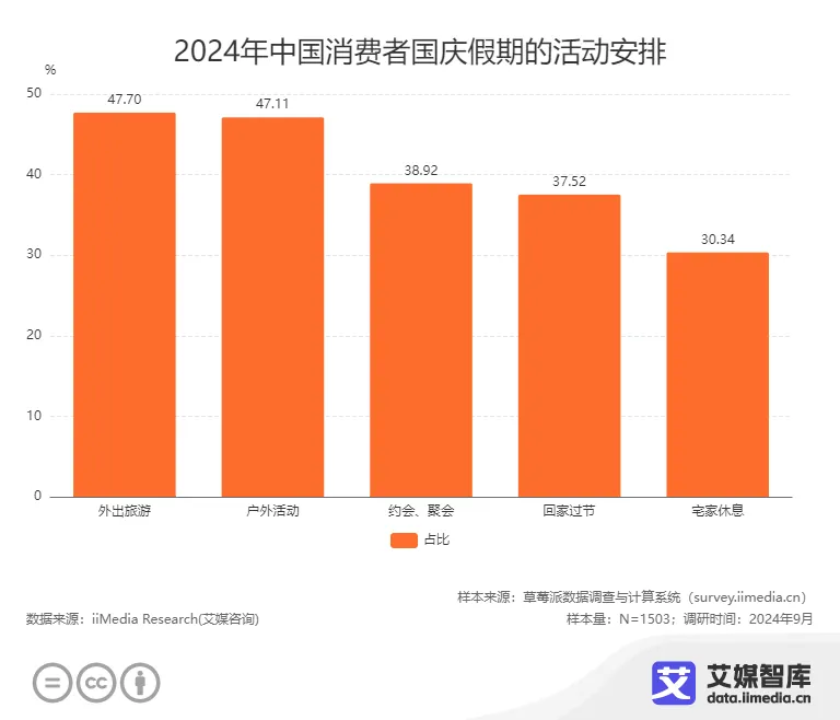 结合艾媒咨询数据来看,2024年的劳动节和国庆节两大出游黄金周,国内消费者的出行热情不减当年。据调研,五一假期期间有85%的受访者表示有出游计划,其中35%的消费者选择省内游,24.7%的消费者选择跨省游;国庆假期中同样有47.7%的消费者选择外出旅游。