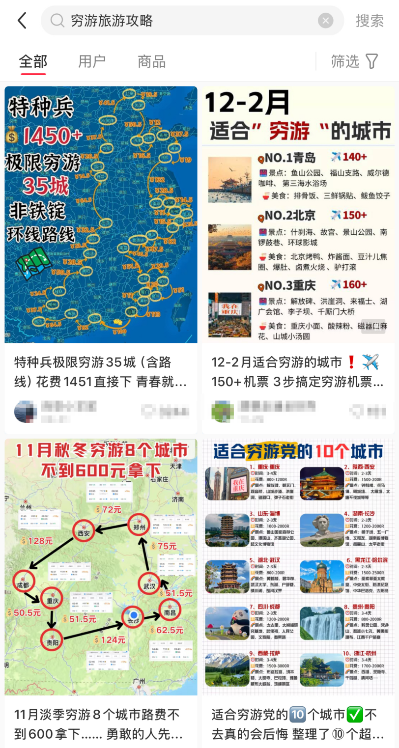 例如拉新人薅平台福利、酒店不要选在市中心、出行交通坐绿皮火车、拒绝跟团采取租车自驾的方式等,只要在预算范围内进行合理安排,同样能够实现精致穷游。如果你在小红书上以“穷游旅游攻略”为关键词进行搜索,能够看到多达56万篇笔记。