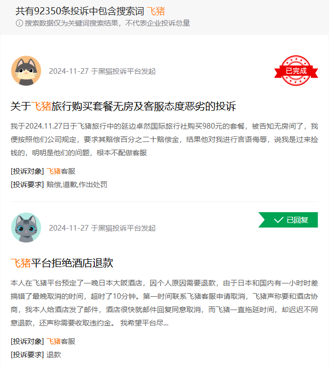 有消费者在黑猫投诉平台吐槽11月底在飞猪购买了温州前往大阪的4人往返机票花费6092元,通过南方航空官方平台核实飞猪购买机票花费5328元,存在764元的价差。只是在后续要求赔偿时,飞猪却以航空公司票价实时变动,无法支持消费者诉求为由进行了拒绝处理。除此之外,还包括飞猪平台的线上订单详情和线下实际要求不符、平台下单被酒店告知无房、阴阳合同…