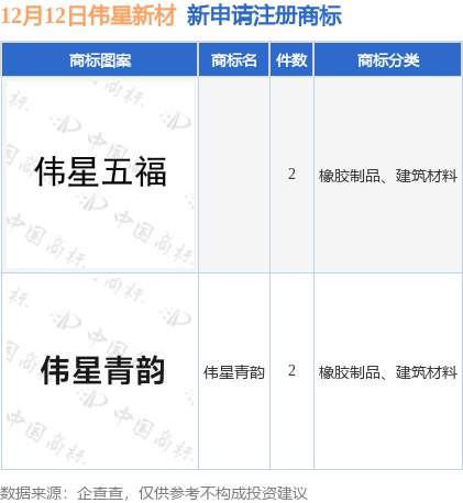 今年以来浙江伟星新型建材股份有限公司新申请注册商标49件,截止目前公司共持有注册商标796件,另有67件商标尚在注册申请中。