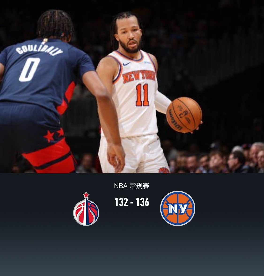 北京时间12月29日NBA常规赛,尼克斯通过加时136-132力克奇才。在第四节最后11.8秒时,布伦森命中抛投绝平比分,尼克斯119-119奇才。随后奇才库利巴利跳投不中,唐斯空切上篮也未中,两队进入加时阶段。最终奇才132-136不敌尼克斯。