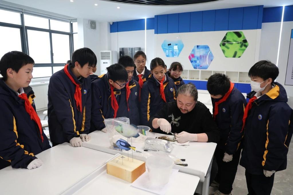 12月18日,中学生跟随上海科技馆标本师学习制作鱼标本。新华社发