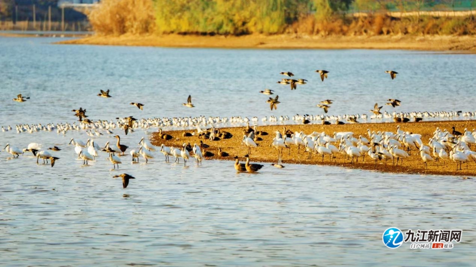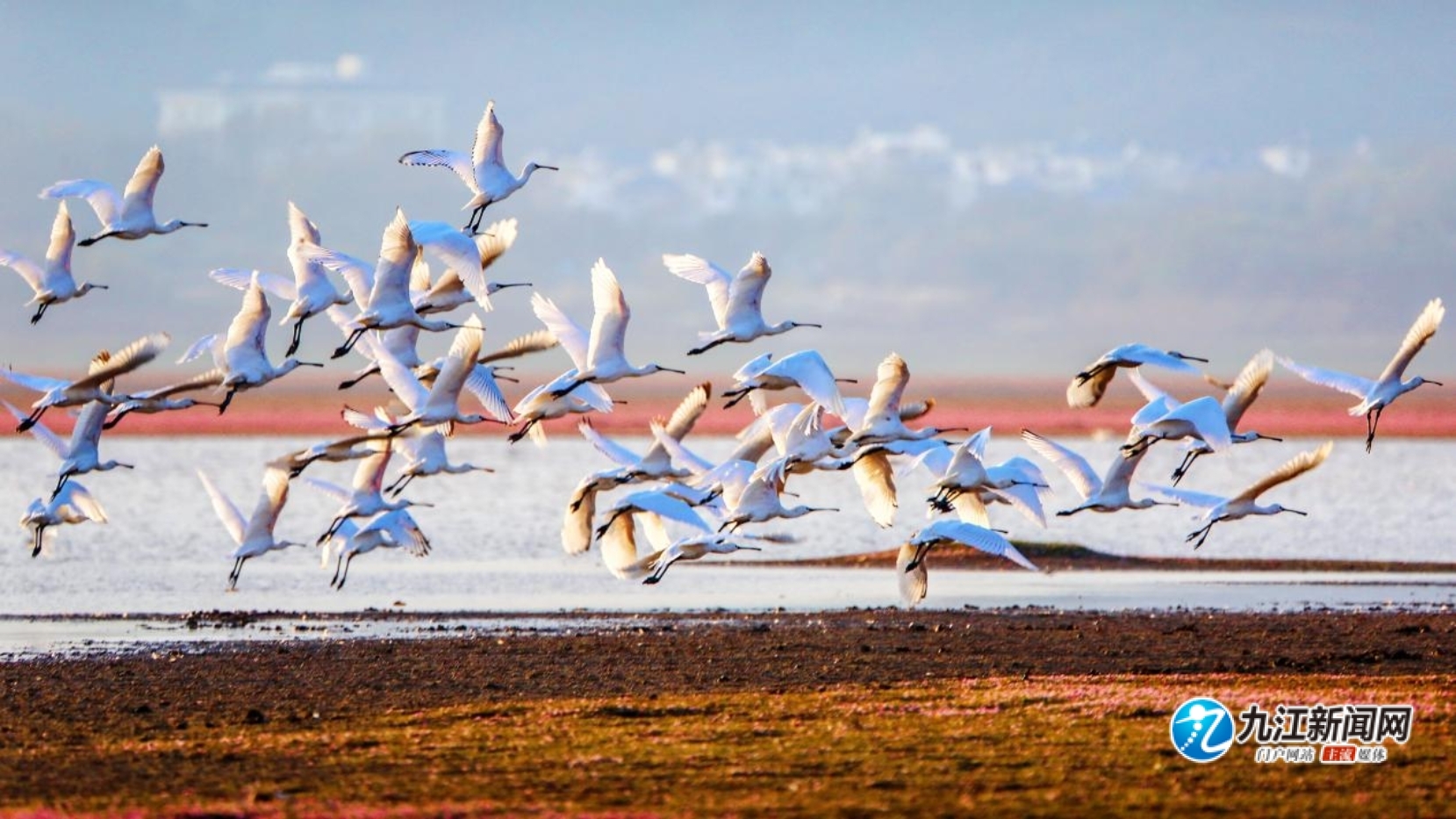 12月25日,在鄱阳湖都昌县大沔池、黄金山等水域的湖滩草洲上,数以万计的珍禽候鸟翩翩起舞,它们时而振翅飞翔、时而觅食嬉戏、时而相互追逐,场景十分壮观。