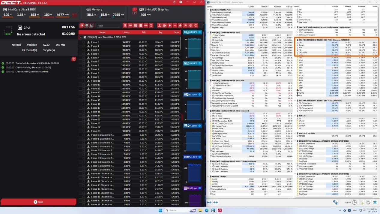 接下来就是重点的烤机测试,Ultra 9 285K处理器即使是使用Intel Default Settings,但是主流的240AIO水冷明显是压不住的,CPU Package温度已经达到101度,此时CPU Package功耗也达到了226W,明显是处理器过度受到了限制。
