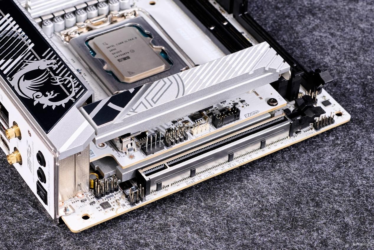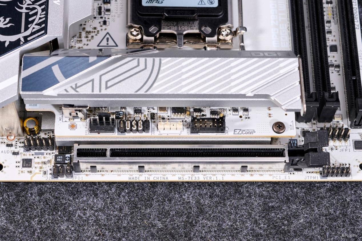 M.2_1接口支持PCIe 5.0 x4,有顾及PCIe 5.0 x4 M.2固态硬盘的高热量,其配上了厚实的EZ M.2 Sheild Frozr II冰霜铠甲。