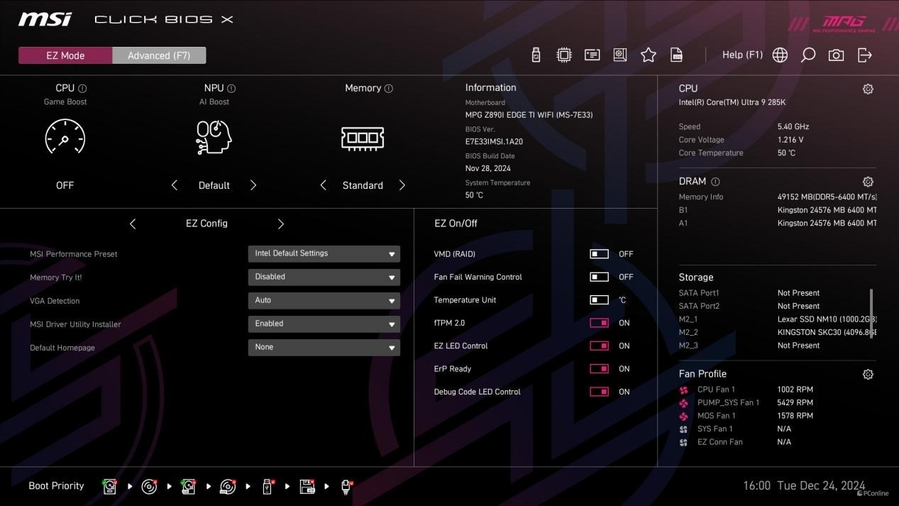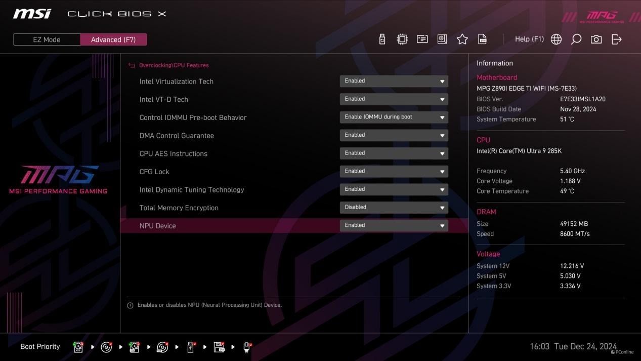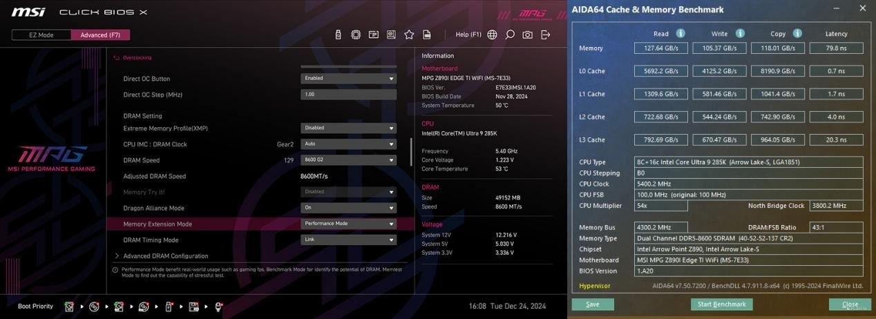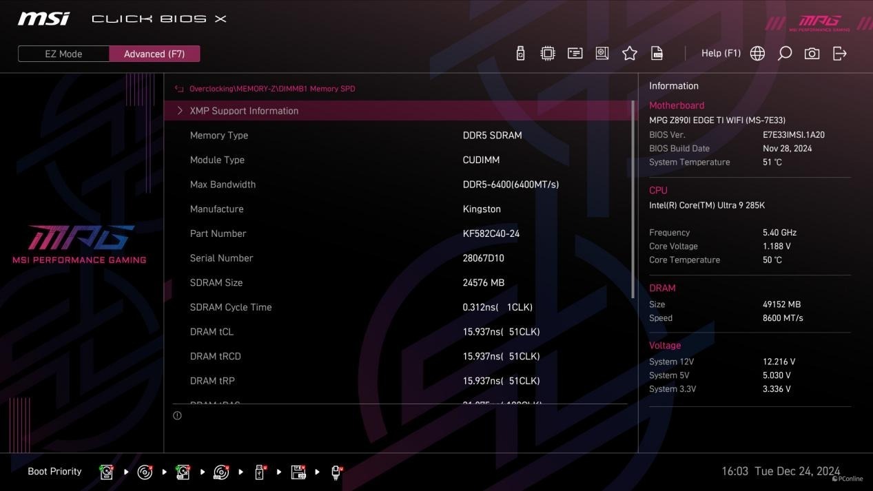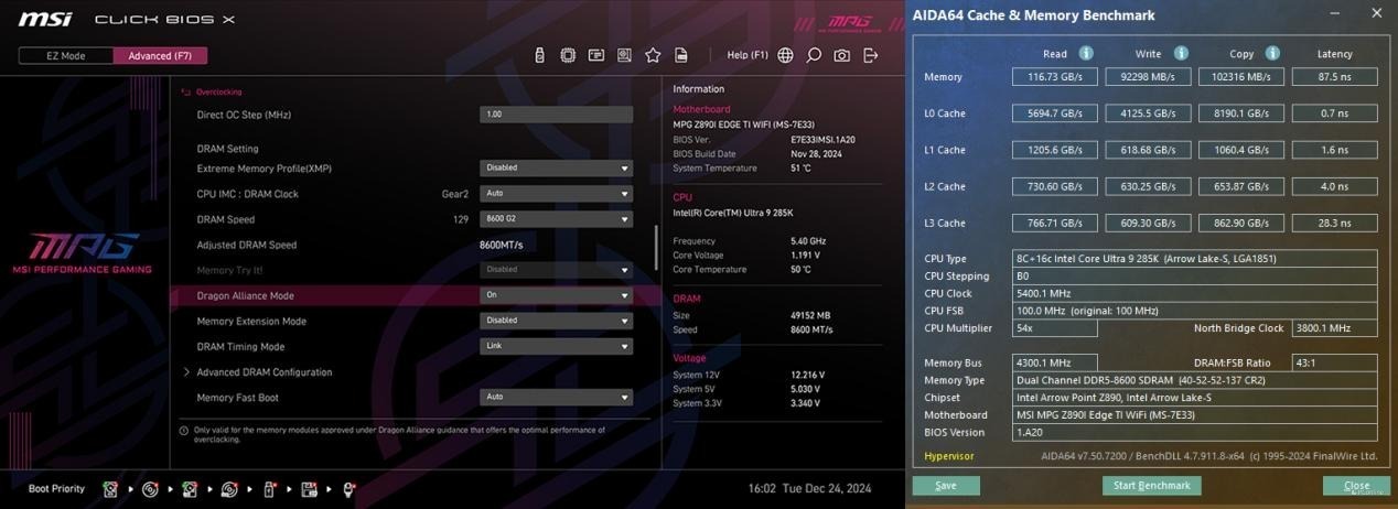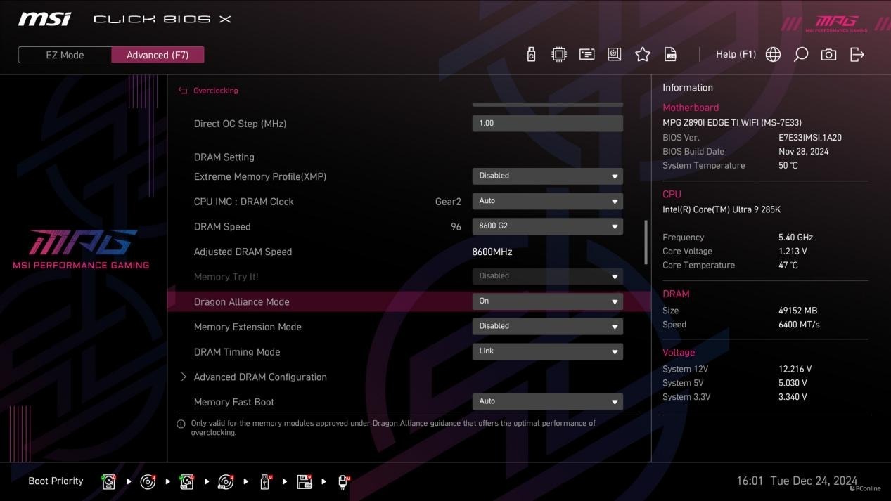 配合上Kingston FURY Renegade DDR5-8200 C40 24G*2内存,微星MPG Z890I EDGE TI WIFI 刀锋 钛主板BIOS中还能开启Dragon Alliance Modea功能,直接就可以让内存频率运行在8600MHz。