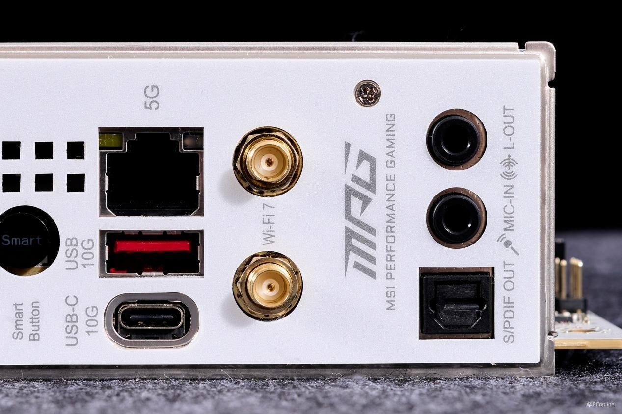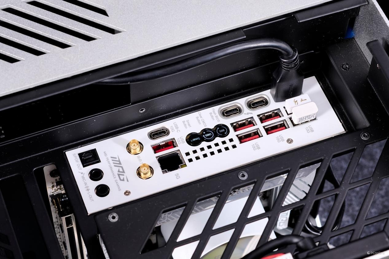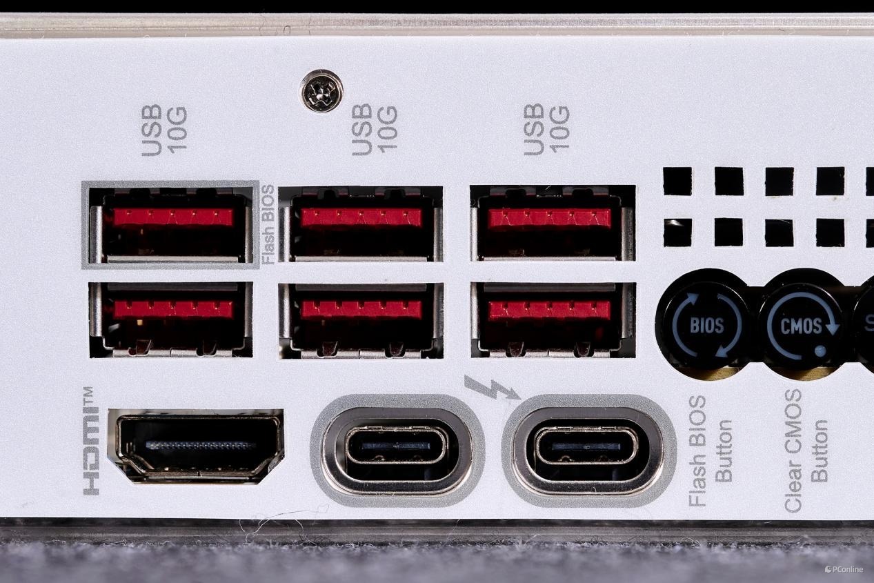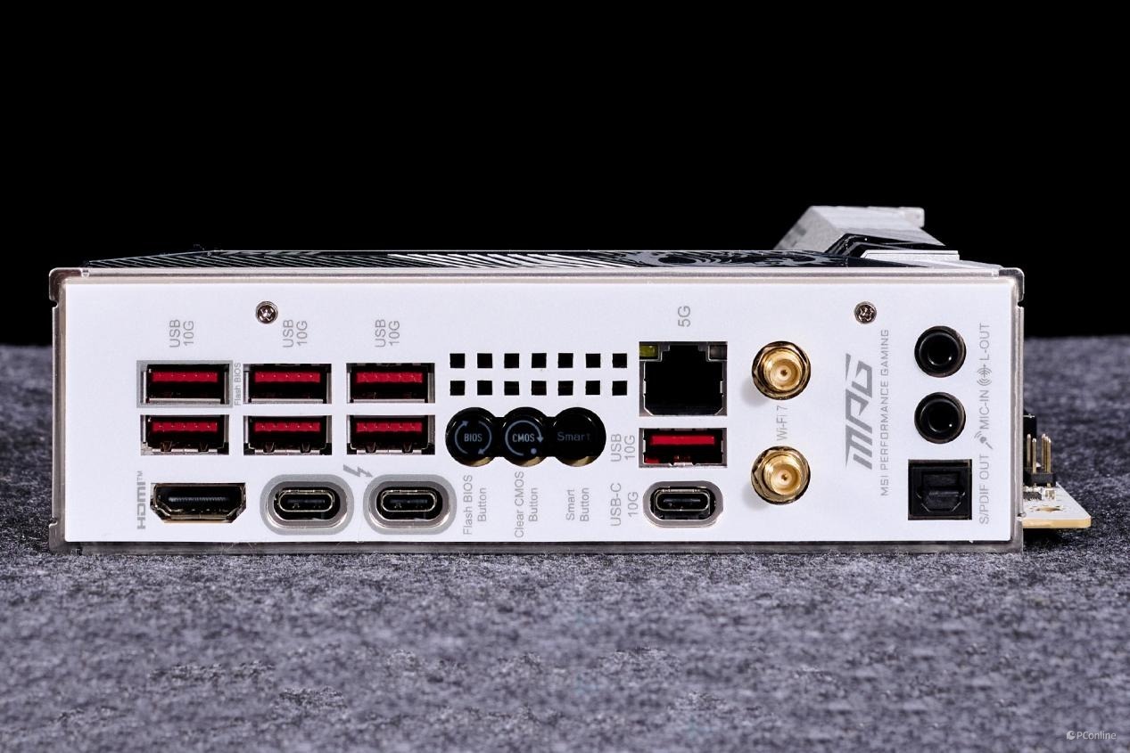 后置面板接口也是相当的丰富,分别是:7 个 USB 10Gbps Type-A接口、HDMI接口、2个雷电4接口、更新 BIOS 按钮、清除 CMOS 按钮、智能按钮、1个USB 10Gbps Type-C接口、5Gbps LAN (RJ45)接口、Wi-Fi 天线接口、音频插孔,以及光纤 S/PDIF 输出接口。