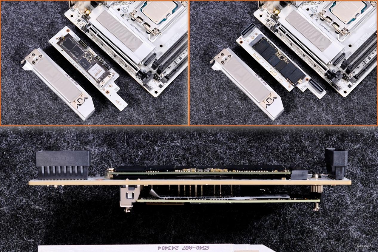 在主板的PCIe 5.0 M.2_1插槽中,我们安装了一块1TB容量的雷克沙NM1090 GEN5固态硬盘作为主硬盘。而在背部的M.2_2插槽中,我们选择了一块4TB容量的金士顿KC3000 GEN4固态硬盘,这款硬盘采用了双面颗粒设计。安装这两款硬盘后,可看到M.2适配卡内仍是充足的空间,即使是安装再厚点的M.2固态硬盘也能容纳。