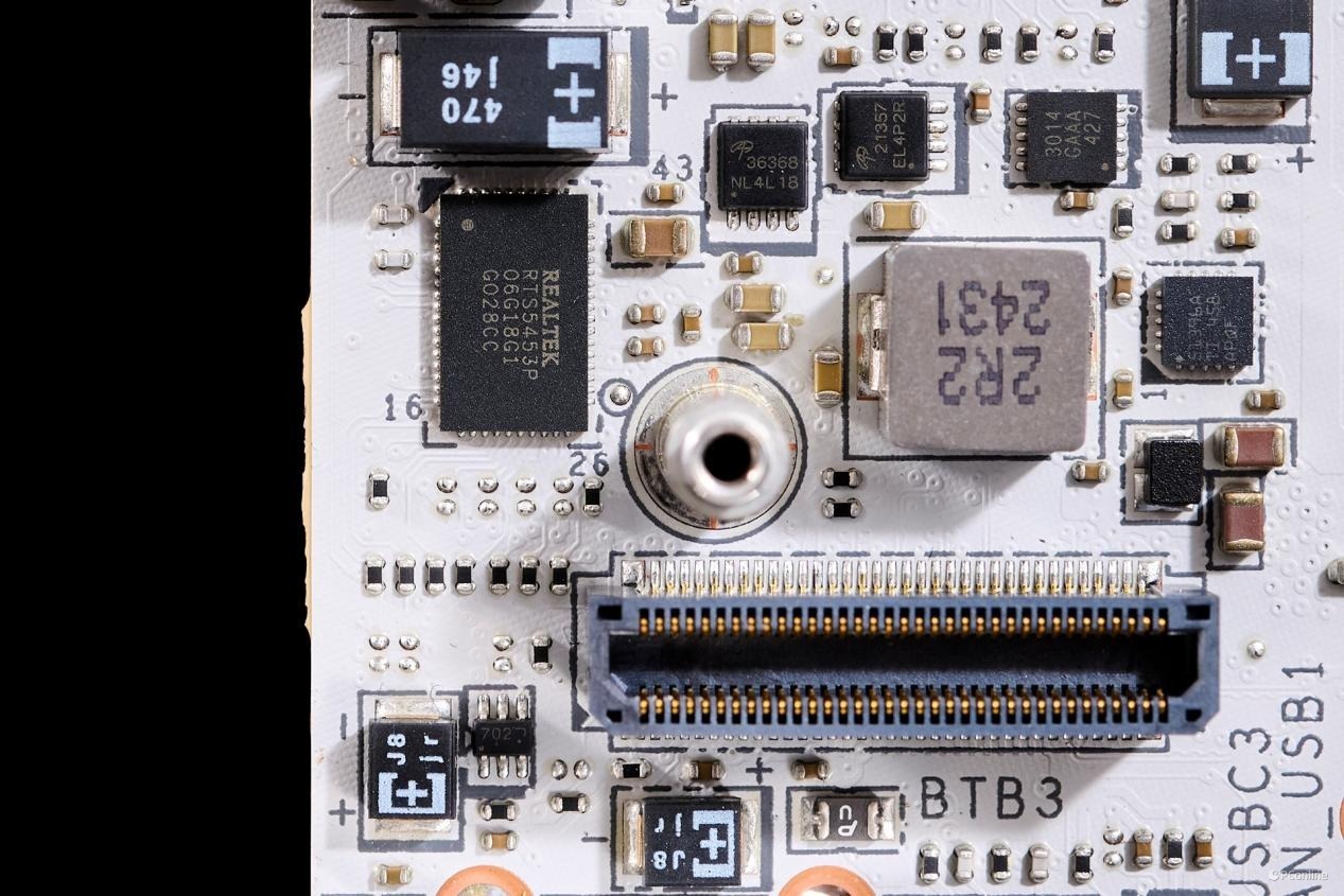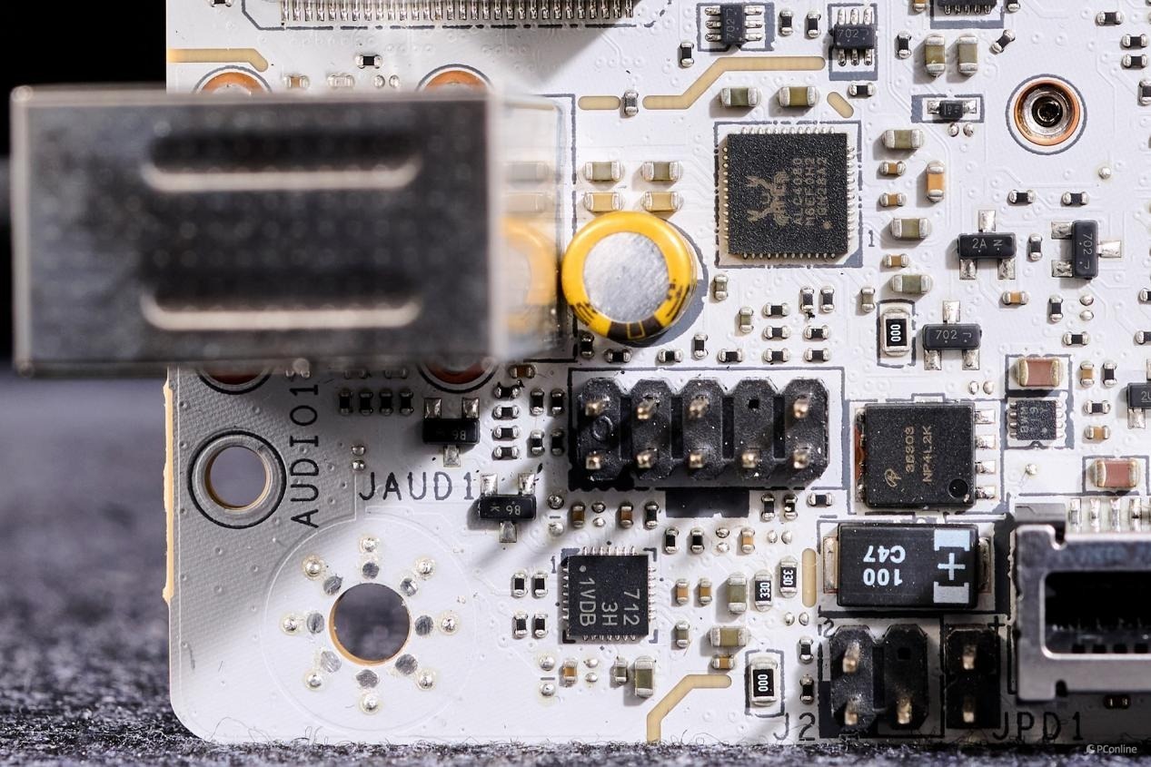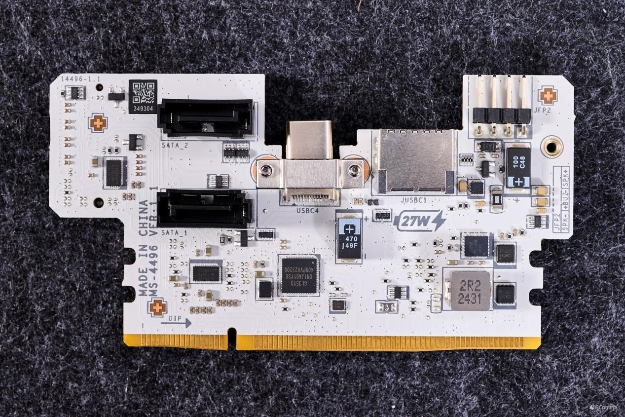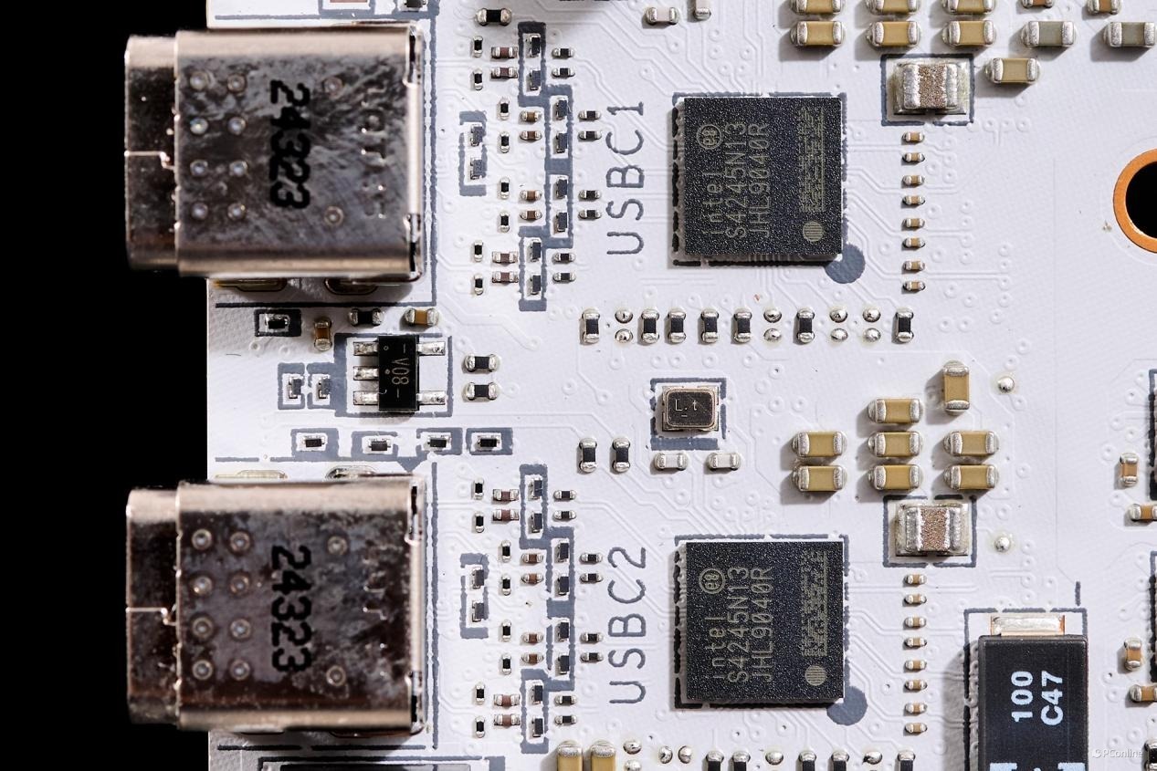 PCB板背面同样有较多的芯片:1颗PI3EQX2024ZTFE,USB 3.2 Gen 2x2 20Gbps重驱动芯片,为JUSB1接口提供带宽;而旁边的驱动电路则是为JUSB1接口提供了27W PD快充支持。