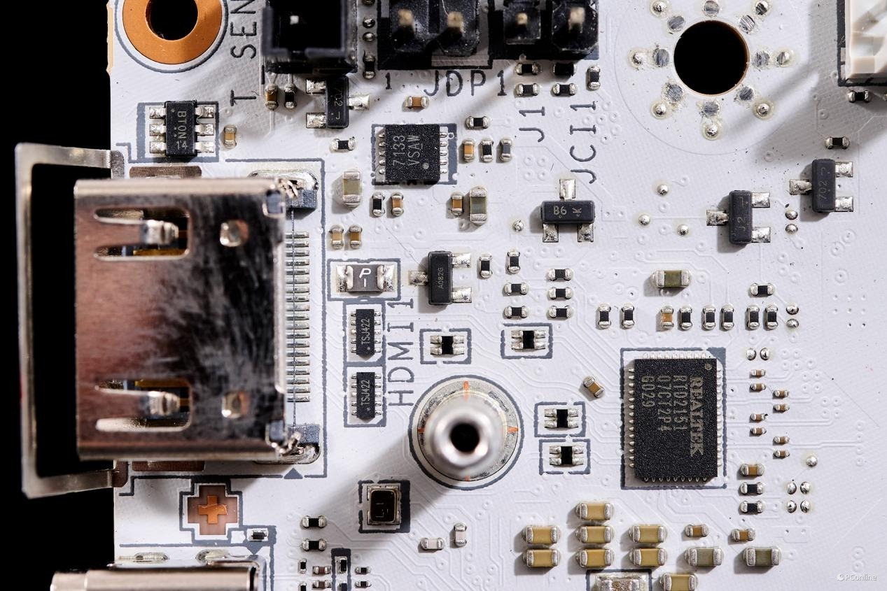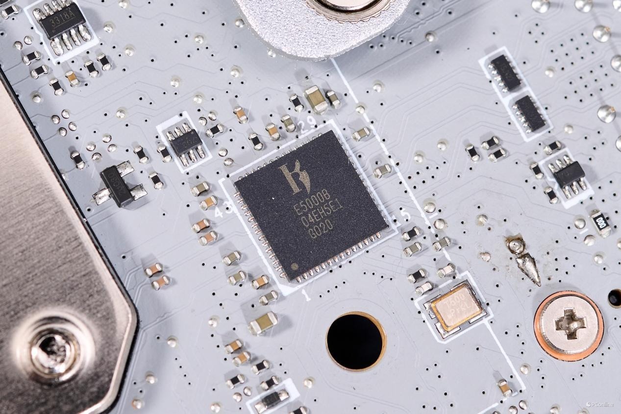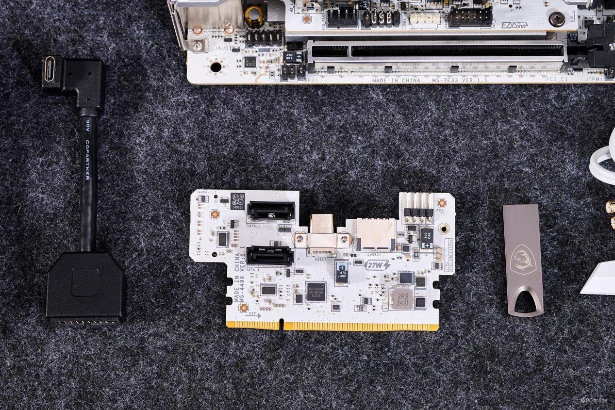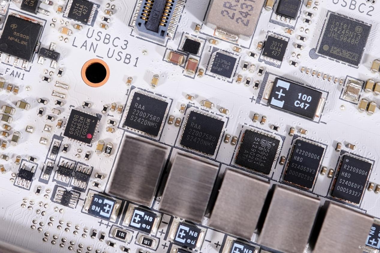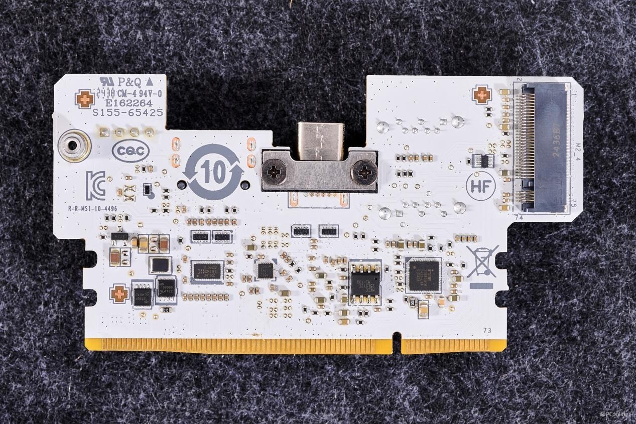 PCB板背面同样有较多的芯片:1颗PI3EQX2024ZTFE,USB 3.2 Gen 2x2 20Gbps重驱动芯片,为JUSB1接口提供带宽;而旁边的驱动电路则是为JUSB1接口提供了27W PD快充支持。
