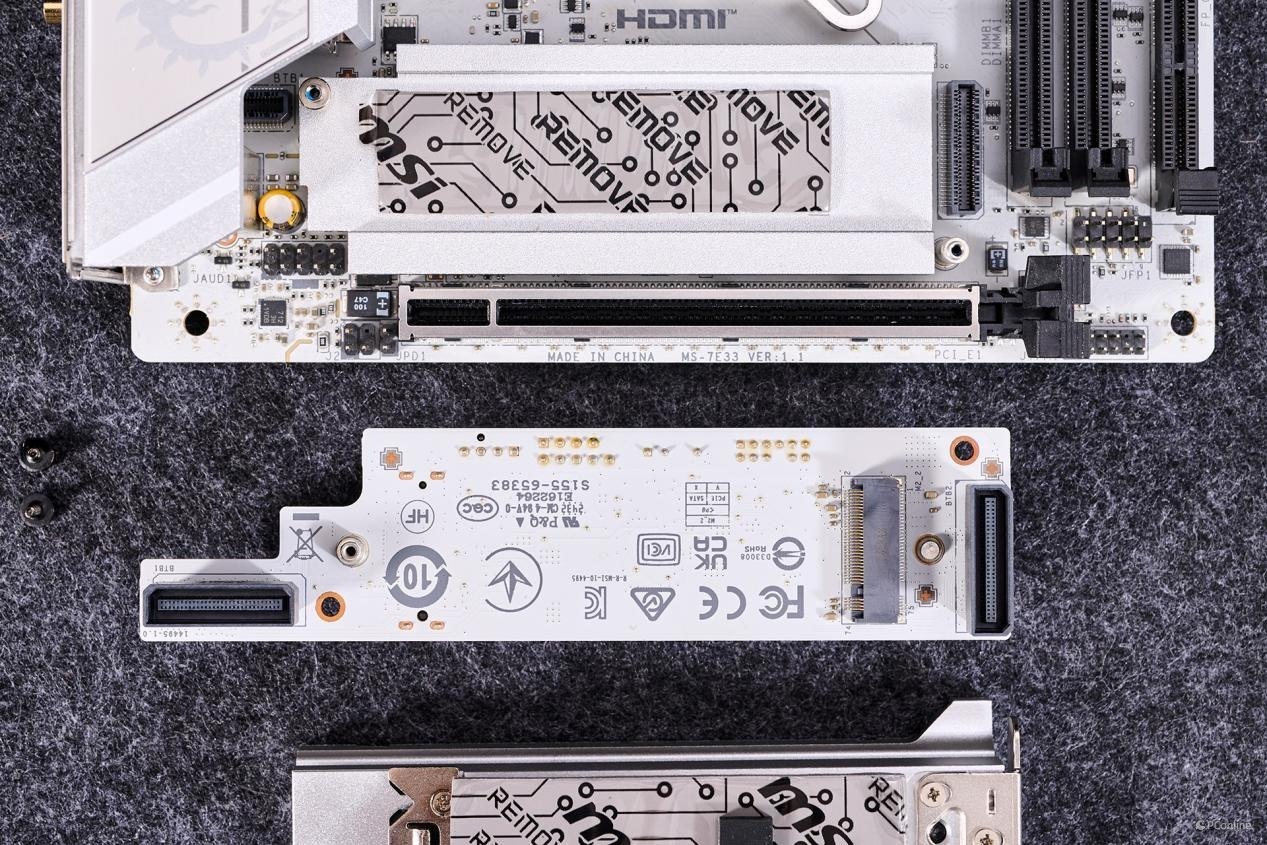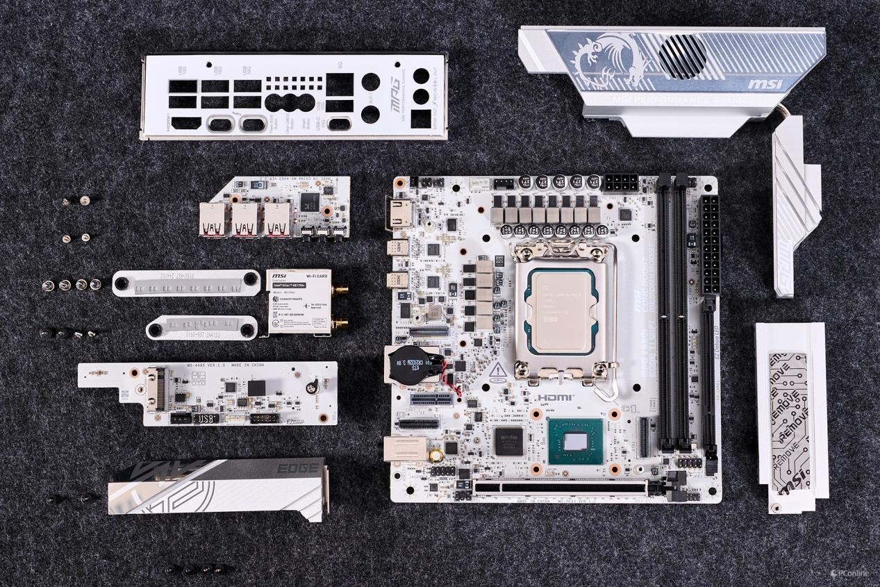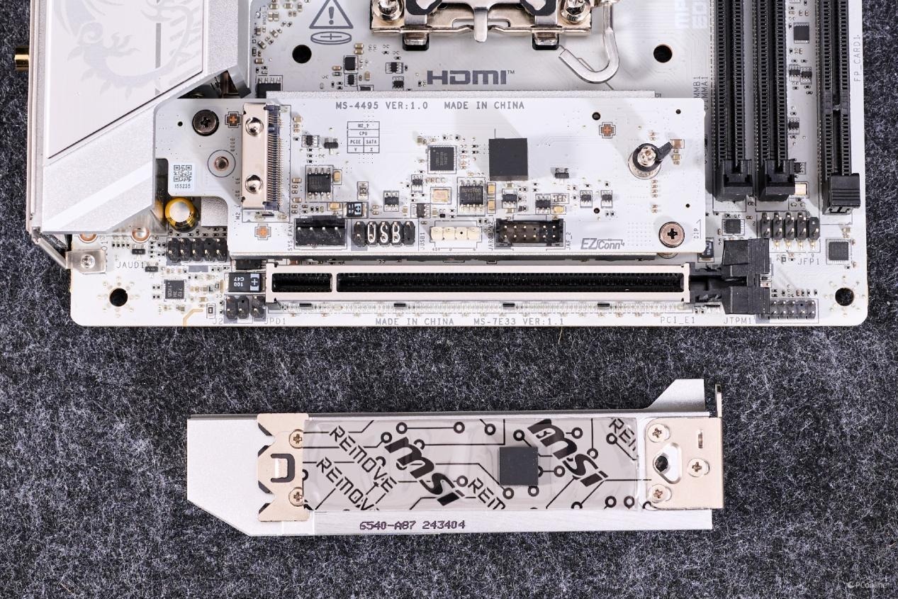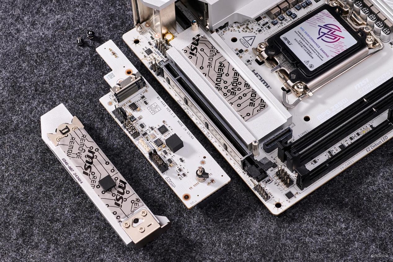微星MPG Z890I EDGE TI WIFI 刀锋 钛主板拆解一览,散热马甲数量比较多,而且都是较为厚实的类型。除了主板本身外,还配上了单独的两个子板扩展更多的设备支持。
