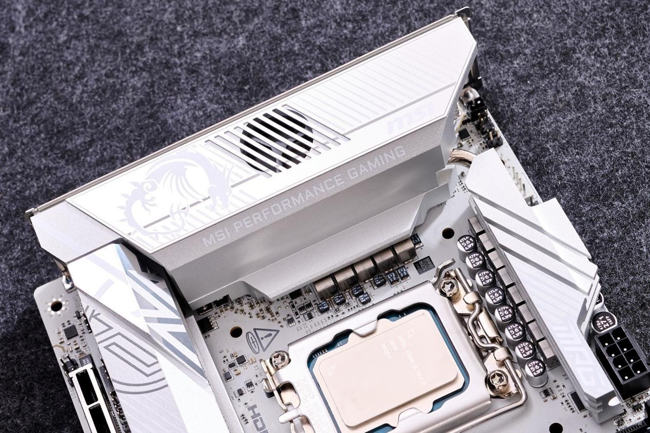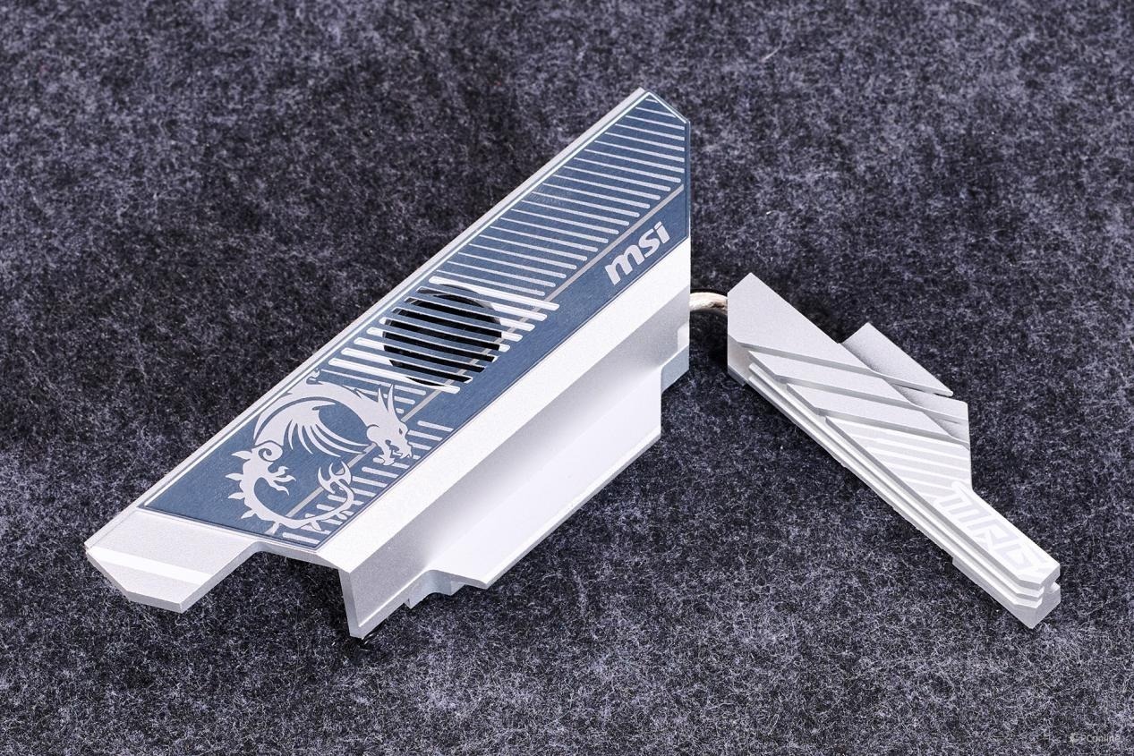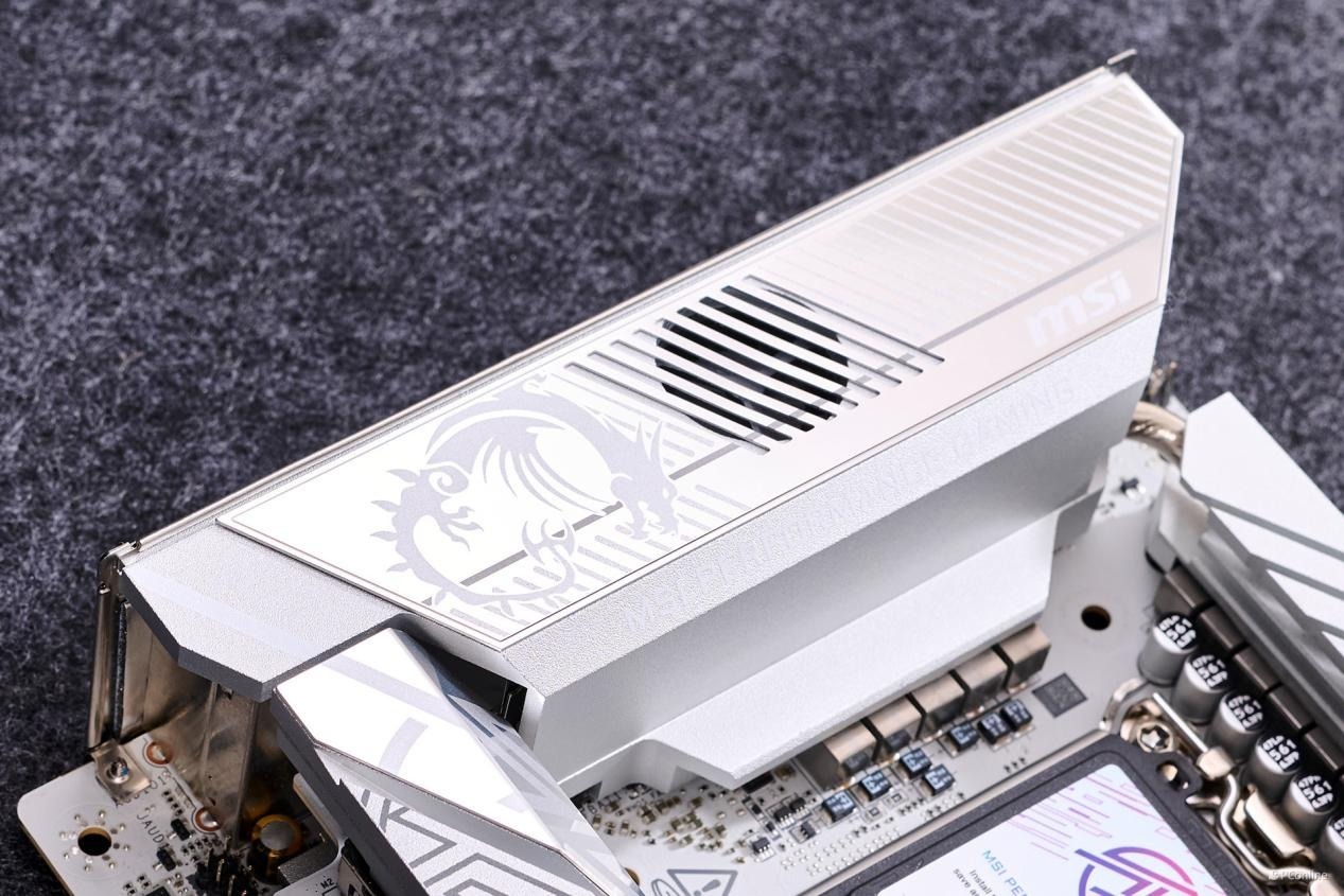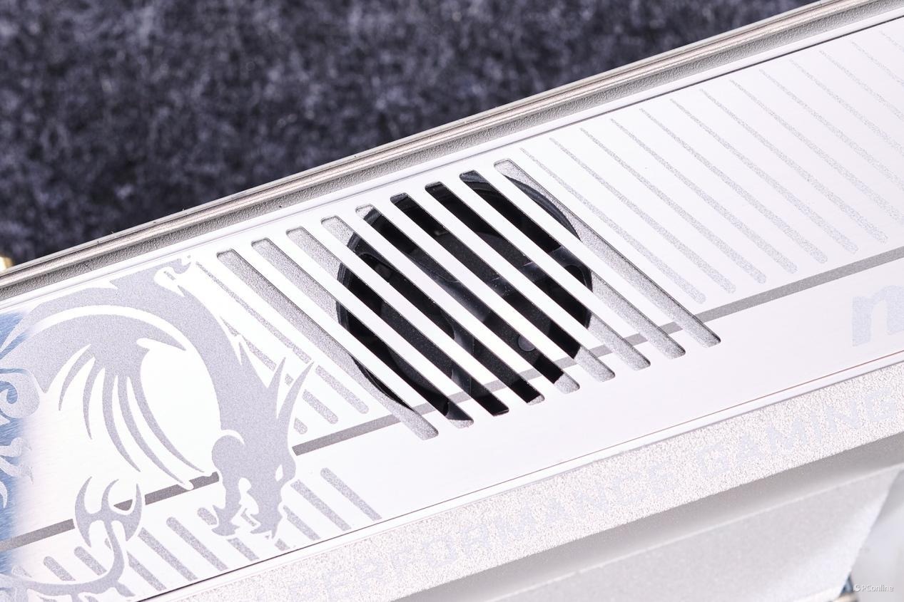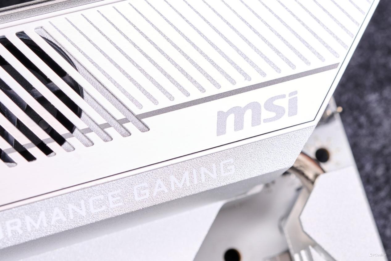 在散热马甲上,微星巧妙地融入了品牌标识“MSI”、龙盾LOGO,以及MPG系列的名称“MSI PERFORMANCE GAMING”,既彰显了品牌身份,也强化了产品系列的专业形象。