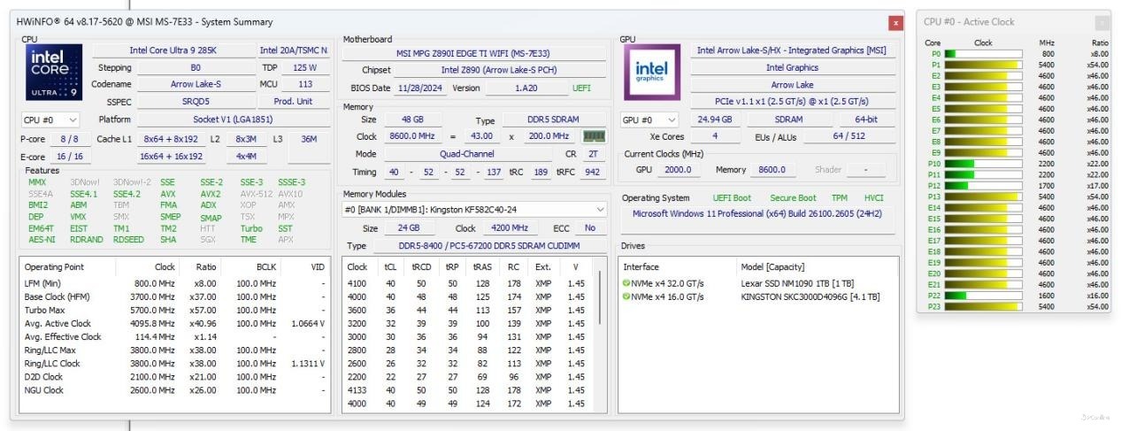 处理器方面我们采用了lntel最新的酷睿Ultra处理器——Ultra 9 285K,对此款主板进行性能压榨,测试其主板在Ultra 9满载的情况下是否仍能发挥出高性能水平。同时内存我们采用了CUDIMM内存——Kingston FURY Renegade DDR5-8200 C40 24G*2套装。