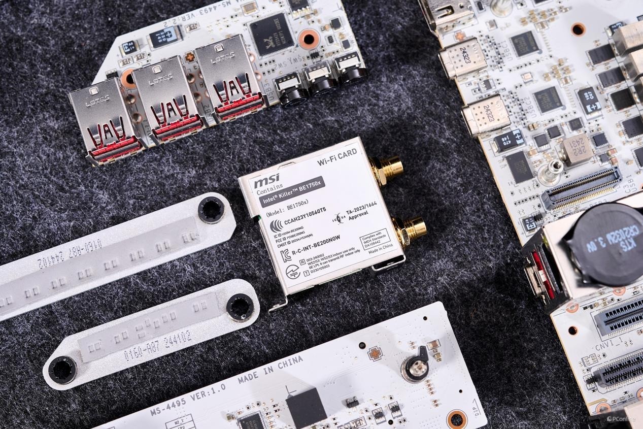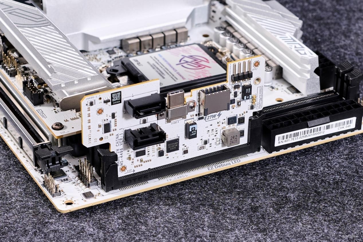按照之前Z890拆解的经验,两颗Intel JHL 9040R 雷电4芯片与Realtek RTS5453P(双Type-C PD芯片)搭配使用,支持40Gbps高速雷电4设备、20Gbps高速USB4设备、10Gbps USB3.2设备,以及支持8K显示输出。