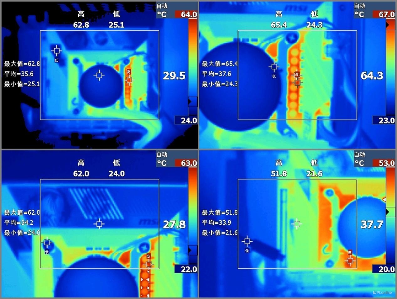 而微星MPG Z890I EDGE TI WIFI 刀锋 钛主板的温控表现是真不错,HWINFO64显示主板的MOS温度为70.5度,同级主板中算主流水平。而我们用IR热成像仪来观察一下主板表现温度,最热点在主板右侧(小散热片)的PCB板上,温度达到了64.3度,但是顶部的大面板散热片温度只有27.8度,小风扇的主动散热效果真猛。