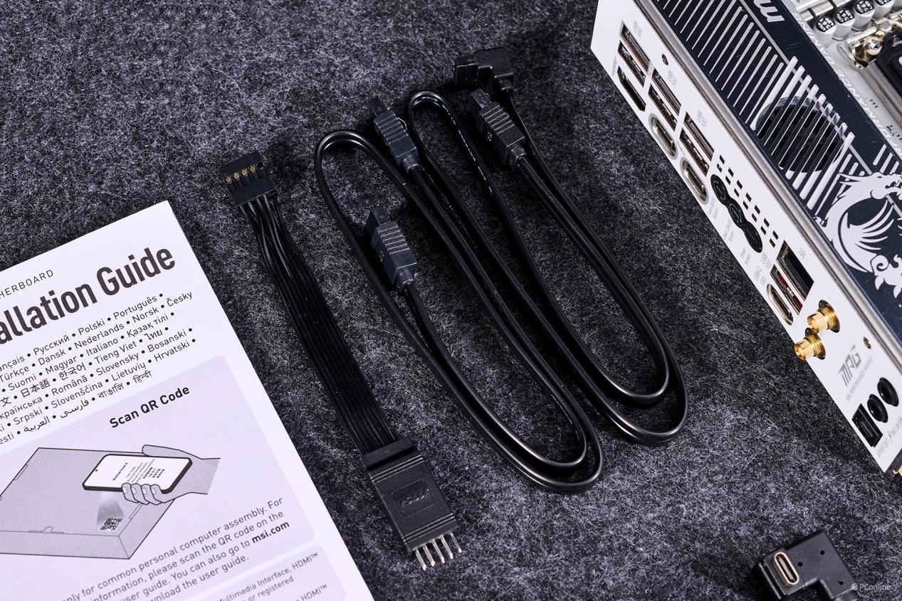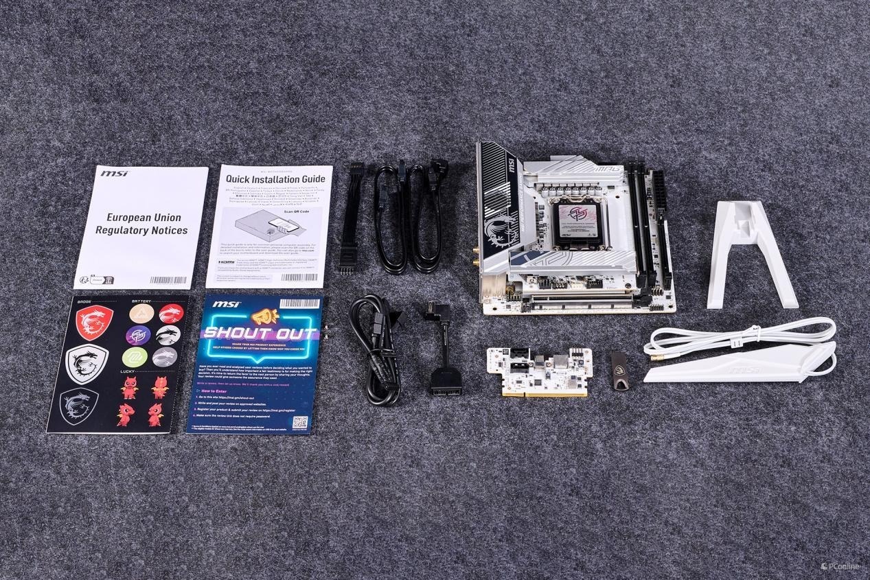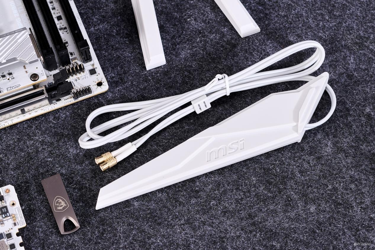 主板配件分别是:快速安装指南、欧洲法规声明、驱动U盘、2个SATA 6Gb/s电缆、EZ前置面板电缆 、1转3 EZ连接电缆 (V2)、5-in-1 XPANDER USB 5Gbps电缆、EZ Wi-Fi天线、M.2 螺丝包装 (3套/包)、5-in-1 XPANDER卡,以及信仰电缆贴纸。