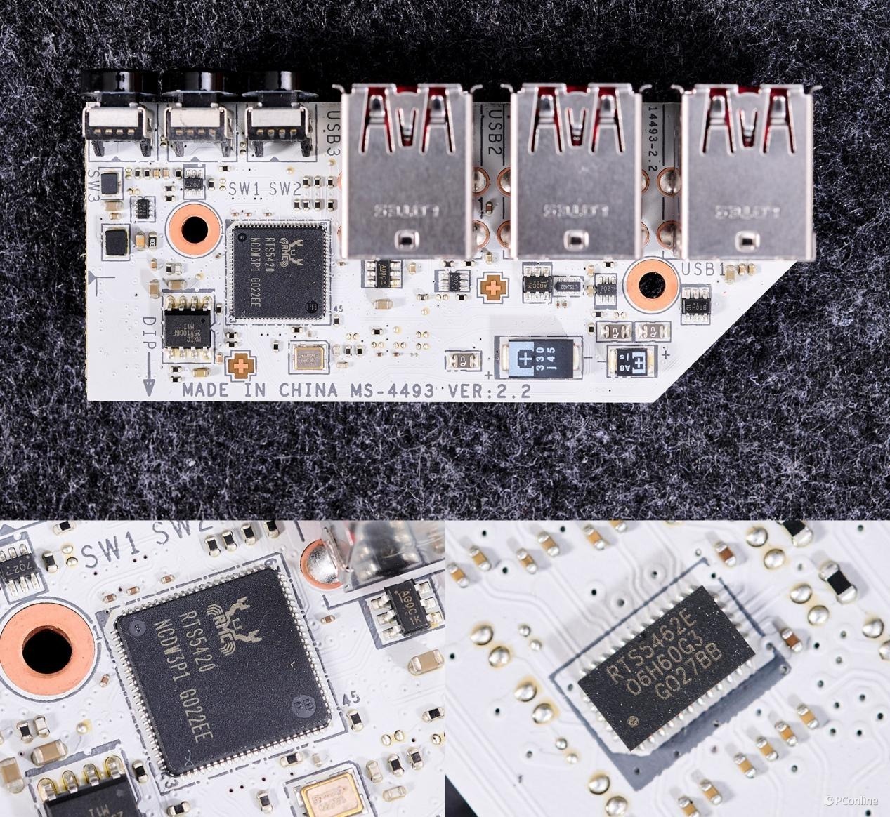 再来看单独的5-in-1 XPANDER卡,PCB正面有2颗GL9932E芯片,PCIe信号放大器,提供给背部的M.2_4插槽使用;1颗GL5323芯片,USB 3.2 Gen 1 HUB芯片,提供给USBC4接口使用,也就是前置两个USB 3.0接口。