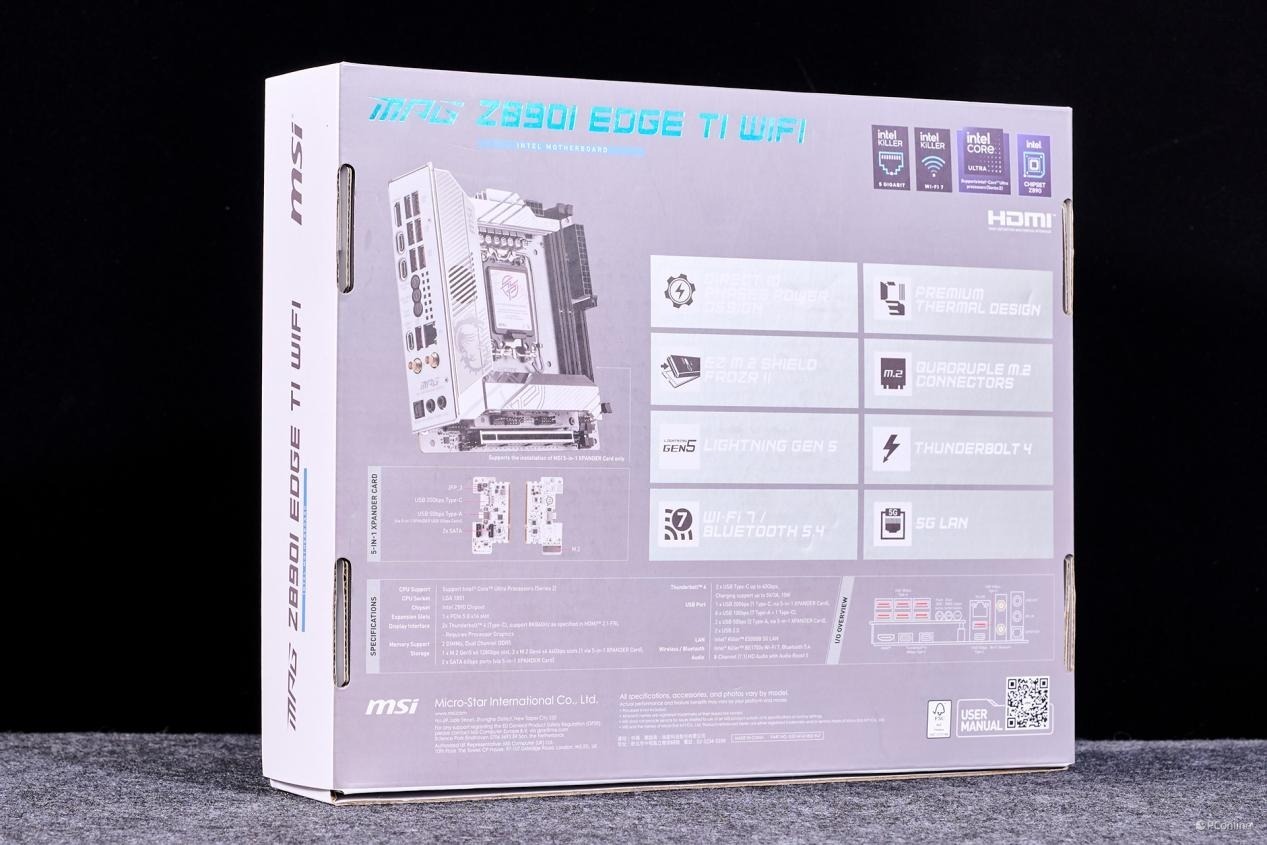 微星MPG Z890I EDGE TI WIFI 刀锋 钛主板外包装的风格与之前我们曾评测的《MPG Z890 EDGE TI WIFI》产品相似,只是ITX规格的微星MPG Z890I EDGE TI WIFI 刀锋 钛主板外包装尺寸上更为小巧。同时产品的8大主要卖点一并在外包装上做展示:10相Vcore供电、扩展型散热片设计、二代M.2 冰霜铠甲、5-in-1 XPANDER 卡、Lightning Gen 5 PCI-E 插槽、雷电4接口、WIFI7无线网络,以及5G有线网络等。