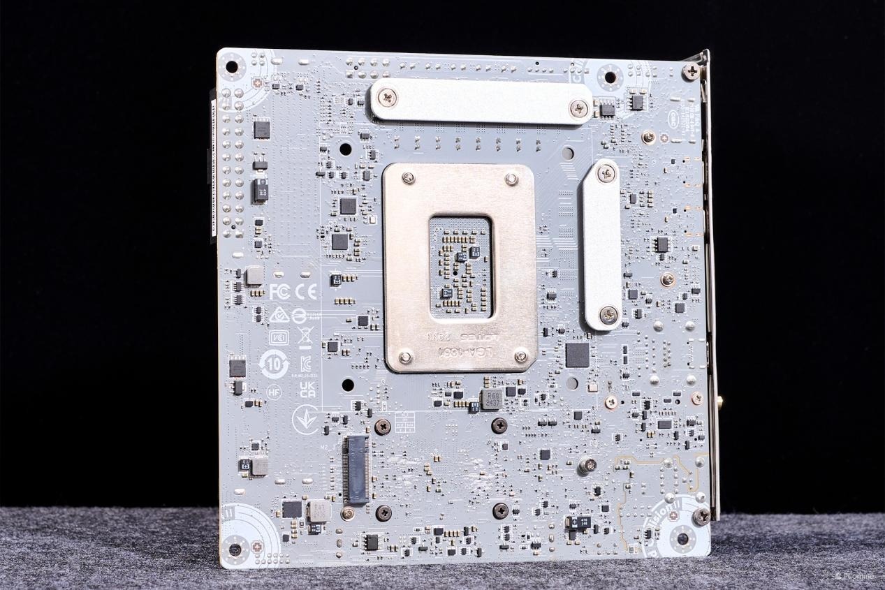 令人觉得可惜的是,这一代的ITX主板上(同级),微星仍是没提供背板,但在处理器的背部利用两个小型的散热马甲进行辅助散热与加固。如上图所示主板背部仍有不少电子元件,估计不少人购买此款主板的玩家会在小黄鱼上开团兼容此款主板的CNC背板。