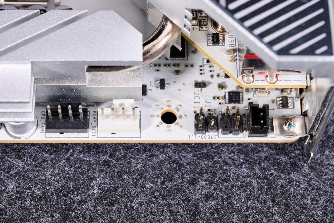 CPU_FAN1与PUMP_SYS1被安放到了主板左上角上,方便用户接线;旁边是T_SEN1: 热敏传感器接口与JCI1: 机箱入侵检测接口。