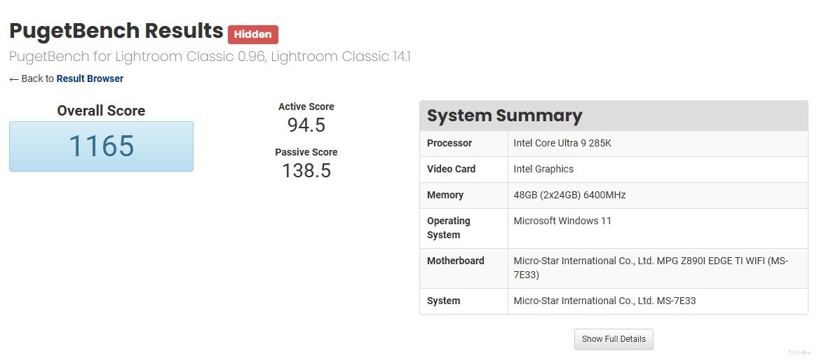 在不安装独立显卡的情况下,我们对主机进行了Adobe Lightroom的PugetBench测试,得分达到了1165分。