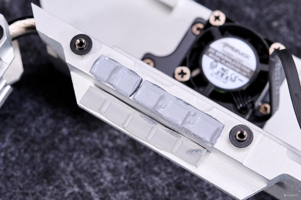 左侧最大的散热马甲上还配上了独立的散热风扇,后续我们还进行了单独的烤机测试,这风扇对散热马甲起到了关键性的作用。