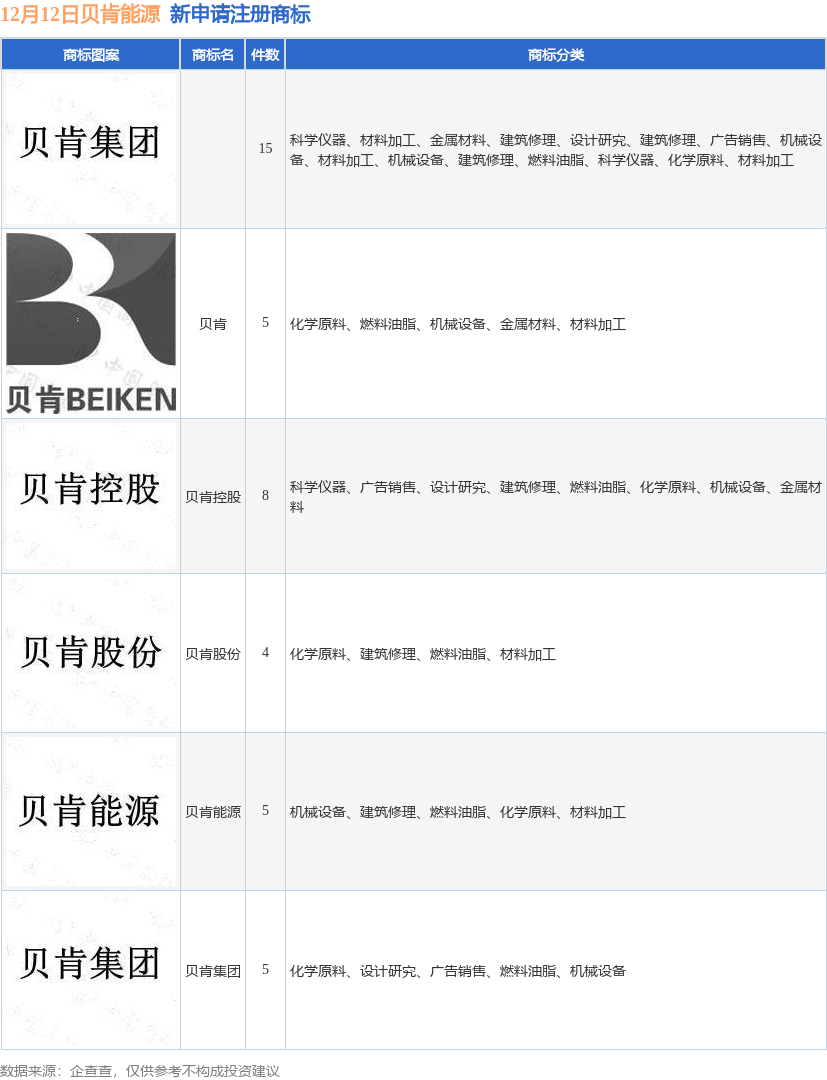今年以来贝肯能源控股集团股份有限公司新申请注册商标42件,截止目前公司共持有注册商标42件,另有42件商标尚在注册申请中。