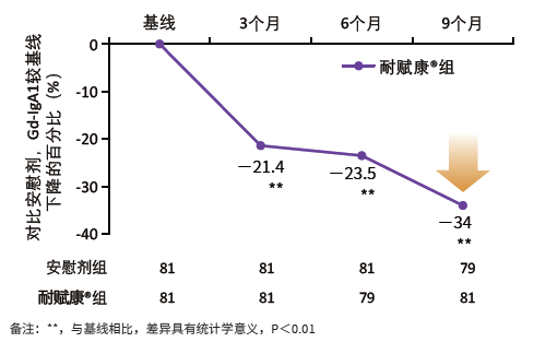 与安慰剂对比,布地奈德肠溶胶囊可以显著降低血清Gd-IgA1即免疫复合物的水平,Gd-IgA1在治疗9个月后降低34%。