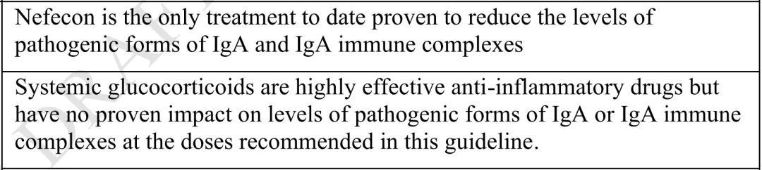 而全身性糖皮质激素是非常有效的抗炎药物,但在新版指南推荐的剂量下,未被证实对致病性IgA或IgA免疫复合物的水平有影响。