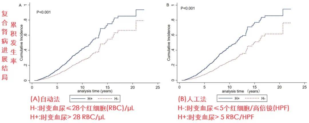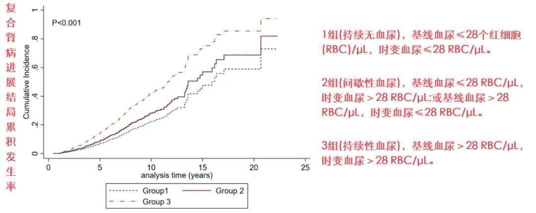 在随访期间,尿红细胞数量越多、持续时间越长的患者,肾病进展风险越大。