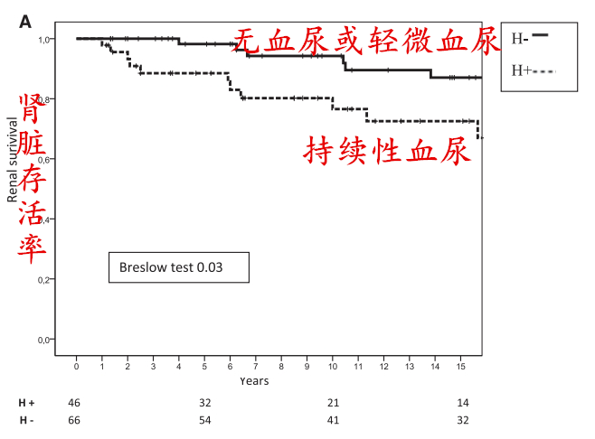 结果可以看到,持续性血尿组的患者肾脏存活率低于无血尿或轻微血尿的患者。