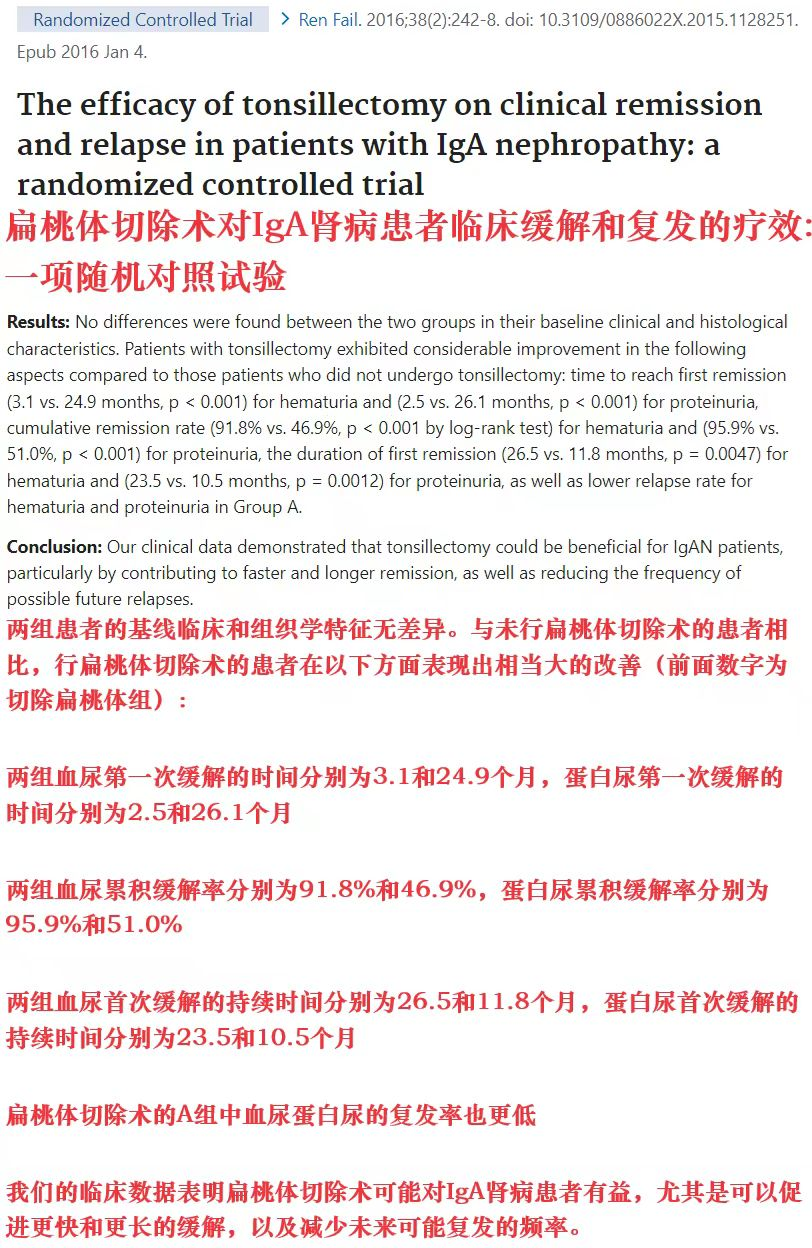 临床上一般仅建议这些肾友可考虑切除扁桃体:IgA肾病中反复肉眼血尿型,扁桃体炎发作次数频繁(如每年发作≥3次)且发作扁桃体炎后严重影响肾病指标(相较于平常尿红细胞和尿蛋白显著增多)和生活质量。