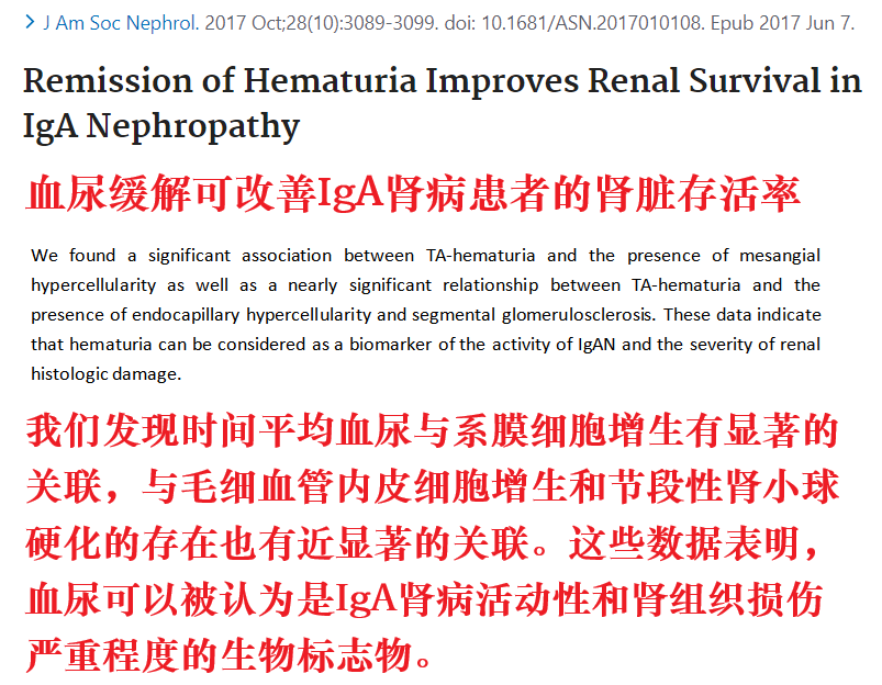 近年来研究发现,血尿也是影响IgA肾病预后的危险因素,尤其是在持续性尿蛋白(尿蛋白>0.5-1g/天)的IgA肾病患者中,合并持续性血尿发生尿毒症的风险显著升高。