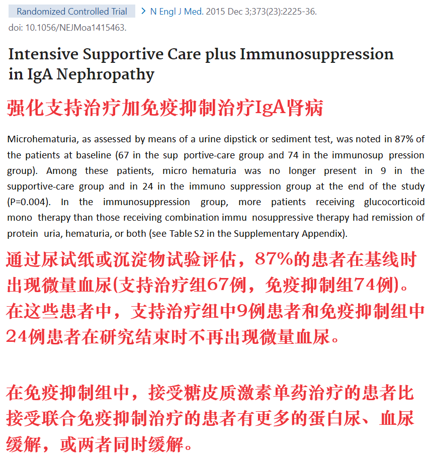 STOP-IgAN试验中,除了激素可以缓解患者的血尿外,免疫抑制治疗组中,部分联合免疫治疗(泼尼松龙+环磷酰胺、硫唑嘌呤)的患者也出现了血尿缓解。