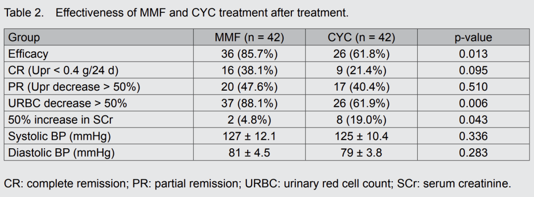 在重度IgA肾病患者中,霉酚酸酯+激素与环磷酰胺+激素均可以降低血尿。一项研究结果显示,霉酚酸酯组红细胞下降超过50%的患者有37例(88.1%),环磷酰胺组有26例(61.9%)。