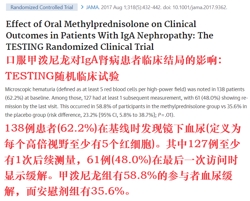 TESTING试验结果显示,糖皮质激素治疗组有58.8%的患者血尿缓解。