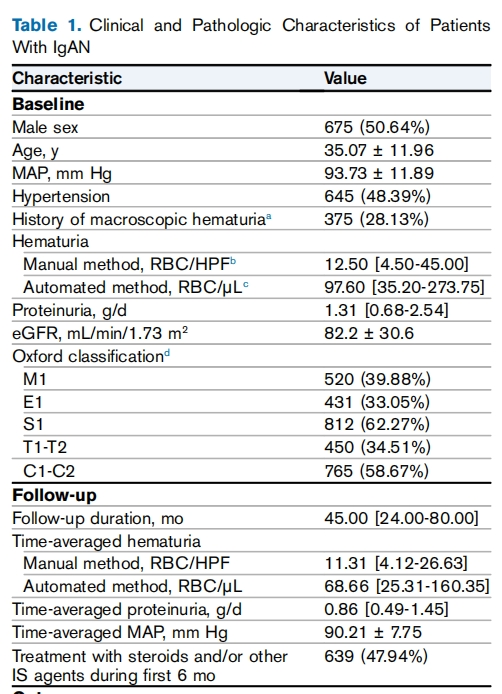 AJKD发表的另一项研究,纳入1333例中国的IgA肾病患者,中位随访时间45个月,最终有207例在随访期发生肾功能下降50%和肾衰竭(其中123例终末期肾衰竭),结果也发现随访期间持续性血尿是发生肾衰竭的独立危险因素。