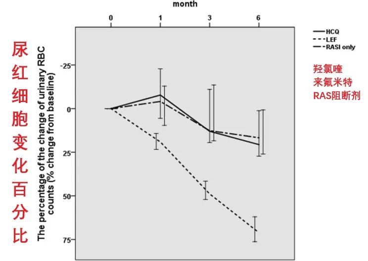 在一项对比来氟米特和羟氯喹治疗IgA肾病的研究显示,来氟米特(20mg/天)治疗6个月后,来氟米特组的平均尿红细胞从基线的43.75/HP降至6个月时的15.13/HP,平均降低71.07%。(羟氯喹和RAS阻断剂组没有统计学差异)
