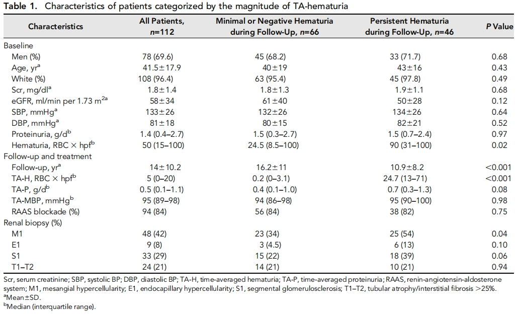 该研究分析结果时,将患者分为2组,人工镜检晨尿的红细胞≤5HP定义为无血尿或轻微血尿;平均时间人工镜检红细胞>5HP定义为持续性血尿,2组患者RAS阻断剂和糖皮质激素使用率无差别。