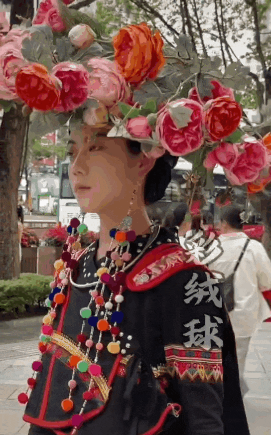 满头的鲜花与对称分布的彩色绒球交相辉映,