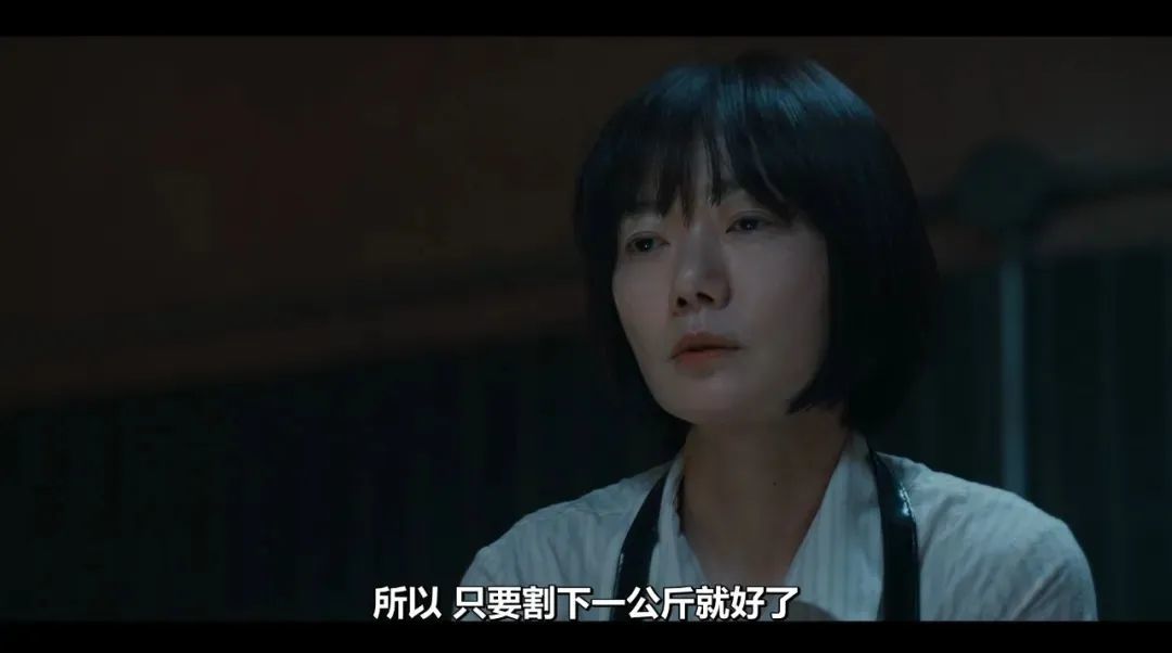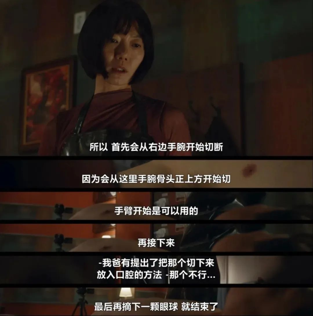 这段拍的特别有电影质感,秀英平静且疯狂,她丝毫不慌张,有条不紊的按照记号切割。