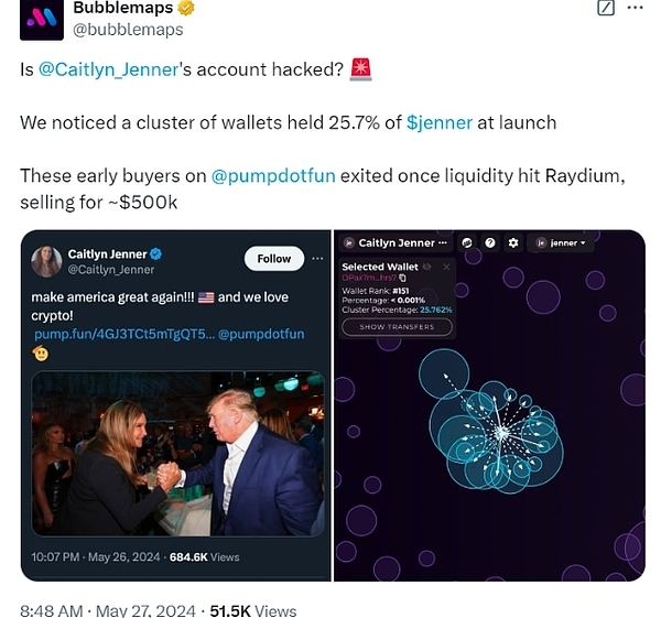 Bubblemaps 表示,在后来的名人代币发行中,一批钱包持有该代币供应量的四分之一,并提前售出,售出了 50 万美元。