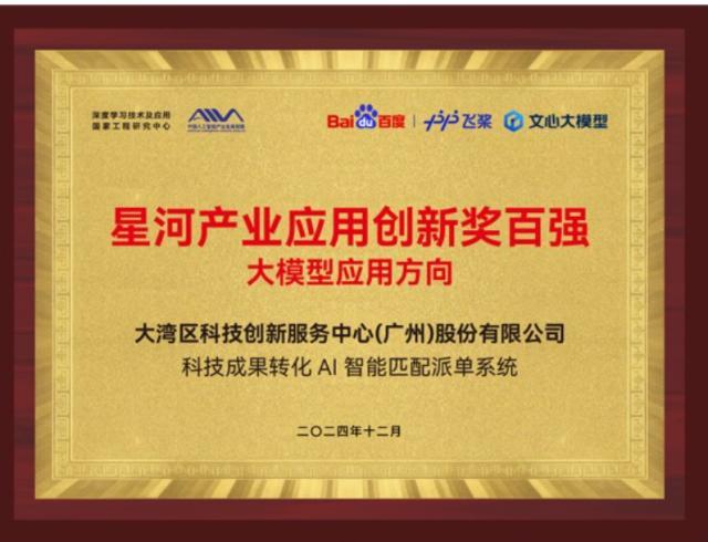 其中,大湾区科技创新服务中心(广州)股份有限公司自主研发的科技成果转化 AI智能匹配派单系统荣获星河产业应用创新奖Top100百强(大模型应用方向)。