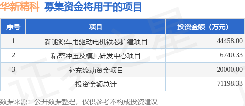 证券之星消息,江阴华新精密科技股份有限公司(简称:华新精科)拟在上交所主板上市,募资总金额为7.12亿元,保荐机构为华泰联合证券有限责任公司。募集资金拟用于新能源车用驱动电机铁芯扩建项目、精密冲压及模具研发中心项目、补充流动资金项目,详见下表: