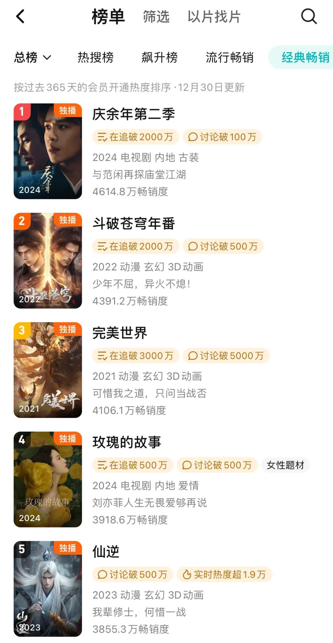 腾讯视频平台总榜中的“经典畅销榜”,总结了过去365天VIP会员开通热度排序,Top10作品中有50%为网文改编动画,且全部来自阅文IP。长期占领平台多个排行榜高位的《斗破苍穹》,原作本就是国内第一本点击量破亿的网络小说,衍生内容众多,向来话题不断,改编动画播放量更是早早突破了250亿。