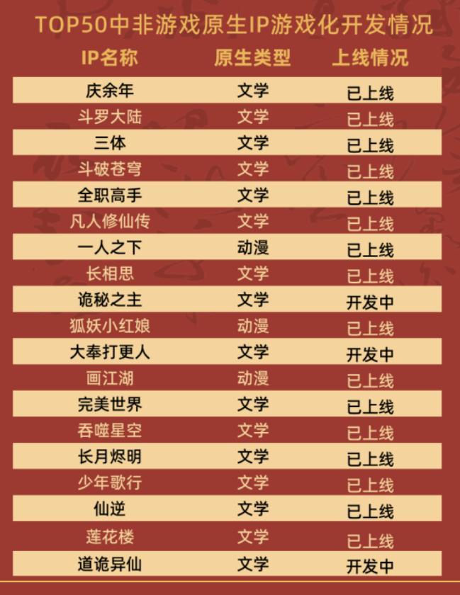 当我们将目光转移到产业链下游,在游戏领域,IP又有不同的“打开方式”。正如《报告》“TOP50中非游戏原生IP游戏化开发情况”表格所示,网络文学内容改编游戏已成常态。