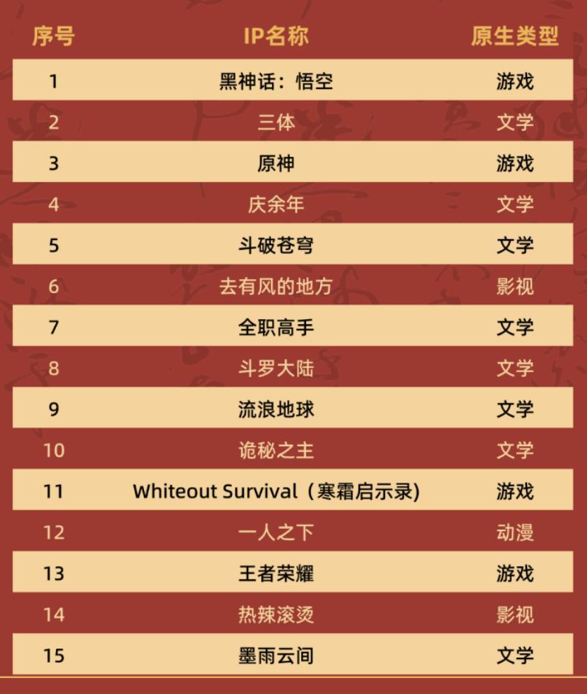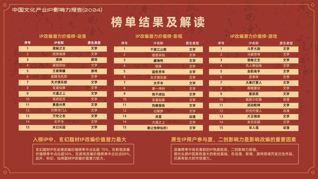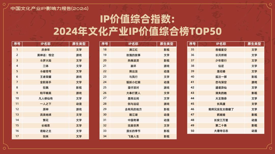 我们在12月29日中国人民大学创意产业技术研究院发布的《中国文化产业IP影响力报告(2024)》(下文简称《报告》)中,找到了答案。