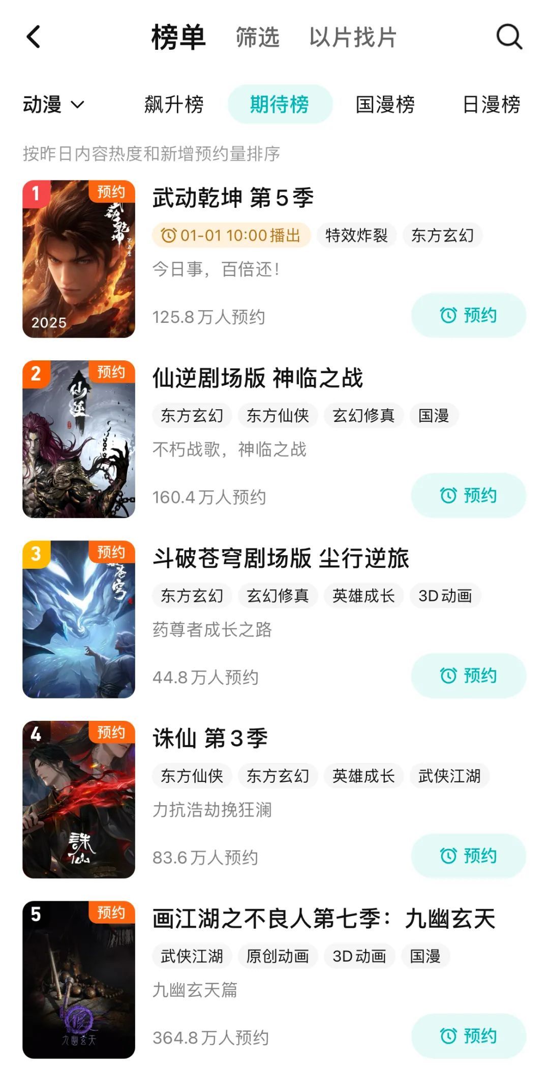 且不说《斗罗大陆》《仙逆》等头部年番都由季番进阶而来,季番也可通过作品系列化,完成长线粉丝积累,《武动乾坤》第五季、《星辰变》第六季的预约人数已破百万,排在平台动漫期待榜前列。季番不仅排播灵活,每季内容也不乏话题爆点。