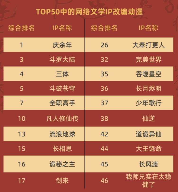 《报告》公布了文化产业IP价值综合榜TOP50、改编潜力价值榜、出海影响力榜等多个榜单。据报告显示,以动漫、游戏为代表的ACGN领域,国产IP、尤其是网络文学IP成为了绝对主力。究其原因,除了网文自身极具吸引力、与国内受众的契合度更高之外,也是IP长期运营、经验积累的结果。